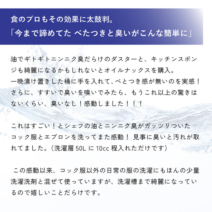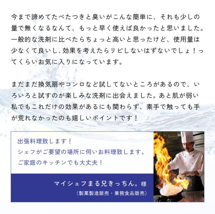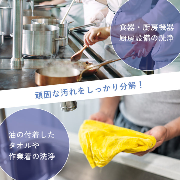 油汚れを落とすだけではなく、その原因となる油脂分を細かく分解し再結合させない油脂分解洗剤です。