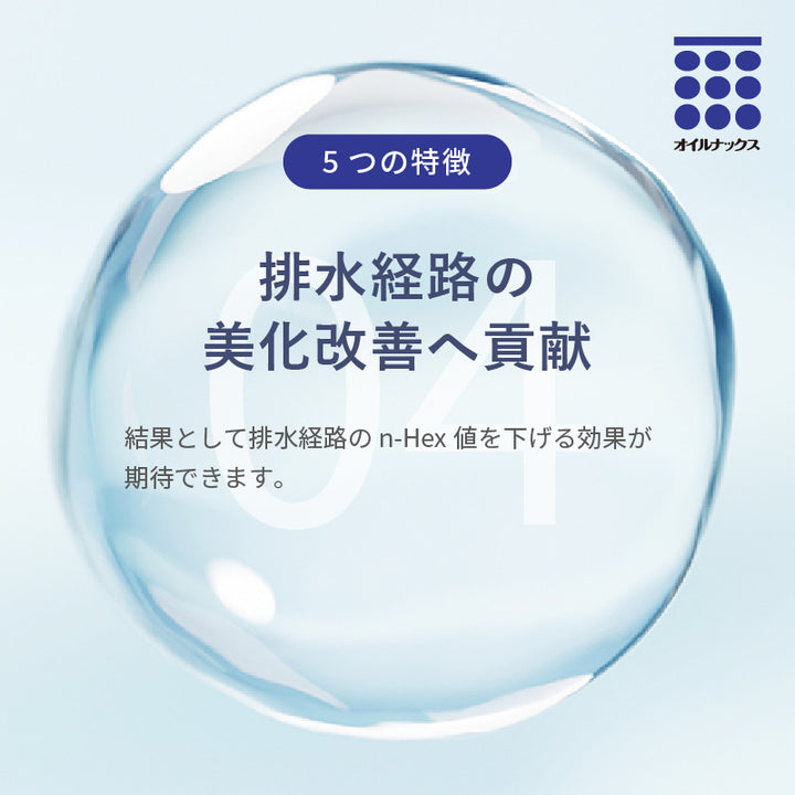 手元の汚れから排水経路の排水溝・排管に付着している汚れまで細かく分解し洗い流します。また通常の洗剤よりも界面活性剤が少なく環境に配慮した万能タイプ洗剤です。