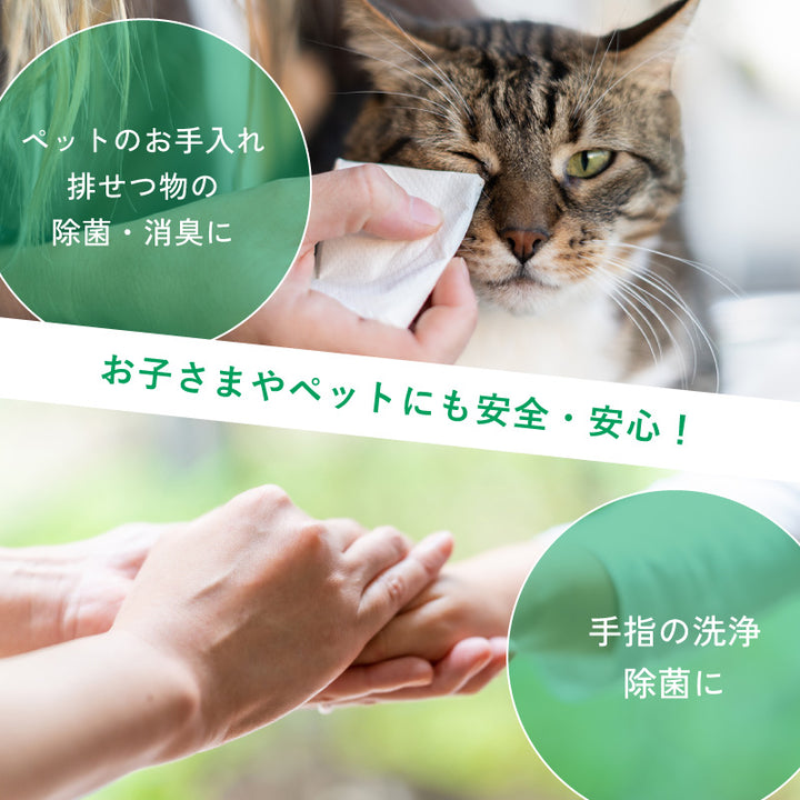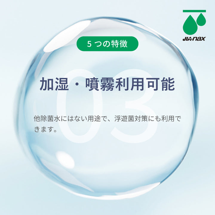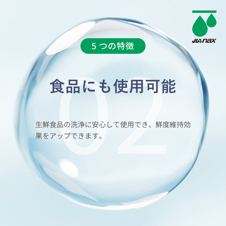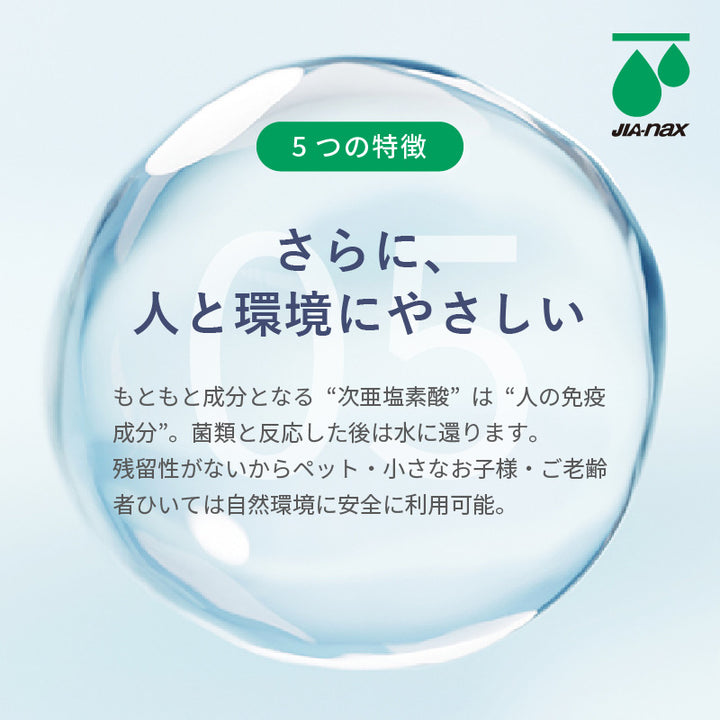 構成する「次亜塩素酸」は”ヒトを含めた動物のもつ免疫成分”、菌類と反応したあとは水に帰るので残留性がなく安全に利用可能です。