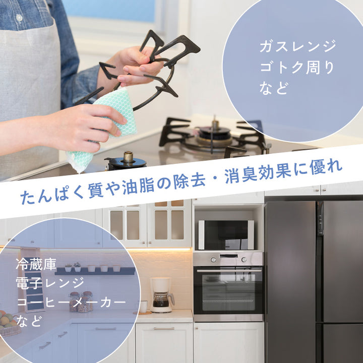 ガス・IHヒーターまわり、電子レンジ、冷蔵庫の汚れの気になるところに直接吹きかけたり、洗剤に浸したタオル等を湿布のようにはってそのままふきとったり、汚れの程度にあわせて利用ができます。
