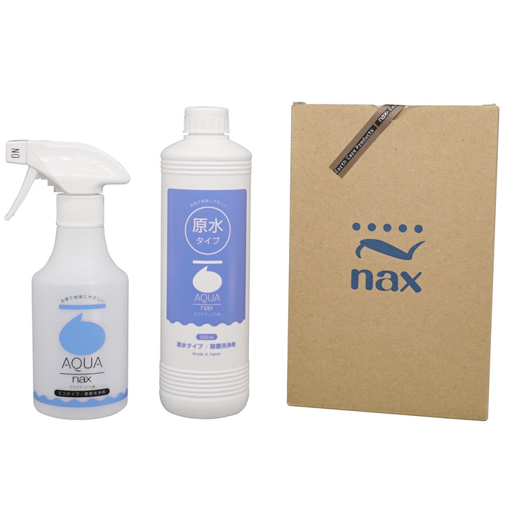 「アクアナックス スプレーボトル(エコタイプ)」と「こぶりな詰め替えボトル(原水タイプ)」がnax箱に入ったそのままプレゼントできるセット。