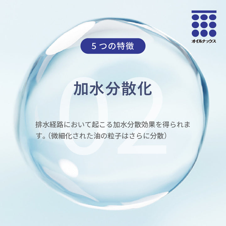 手元の汚れから排水経路の排水溝・排管に付着している汚れまで細かく分解し洗い流します。また通常の洗剤よりも界面活性剤が少なく環境に配慮した万能タイプ洗剤です。
